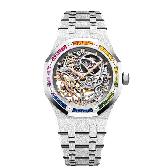 Rhodium-toned openworked dial, pink gold applied hour-markers and Royal Oak hands with luminescent coating.
