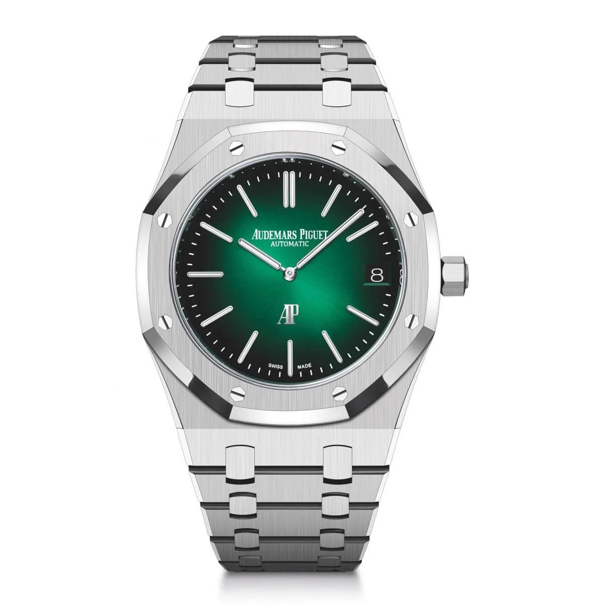 Audemars Piguet Royal Oak “Jumbo” Extra-Thin (ref 16202PT.OO.1240PT.01) features an automatic movement; green dial; sapphire-crystal, transparent case back; and 39 mm, platinum case on a platinum strap with a platinum folding clasp.