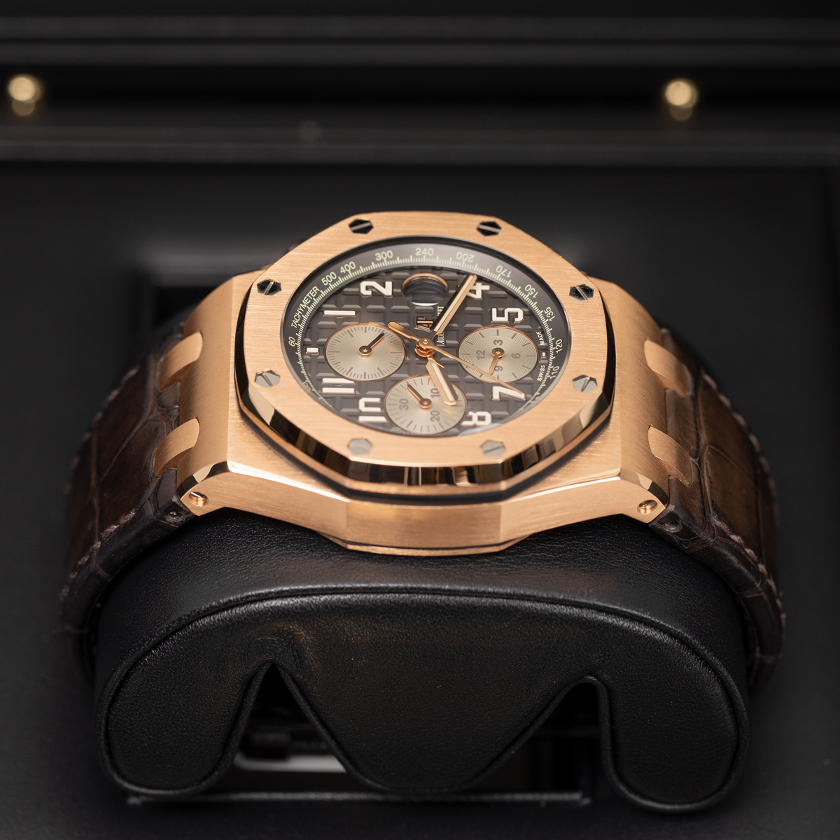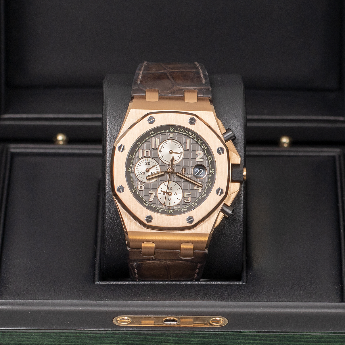 Grey ruthenium-toned dial with “Méga Tapisserie” pattern, ivory-toned counters, pink gold-toned Arabic numerals with beige luminescent coating, pink gold Royal Oak hands with beige luminescent coating, grey ruthenium-toned inner bezel.