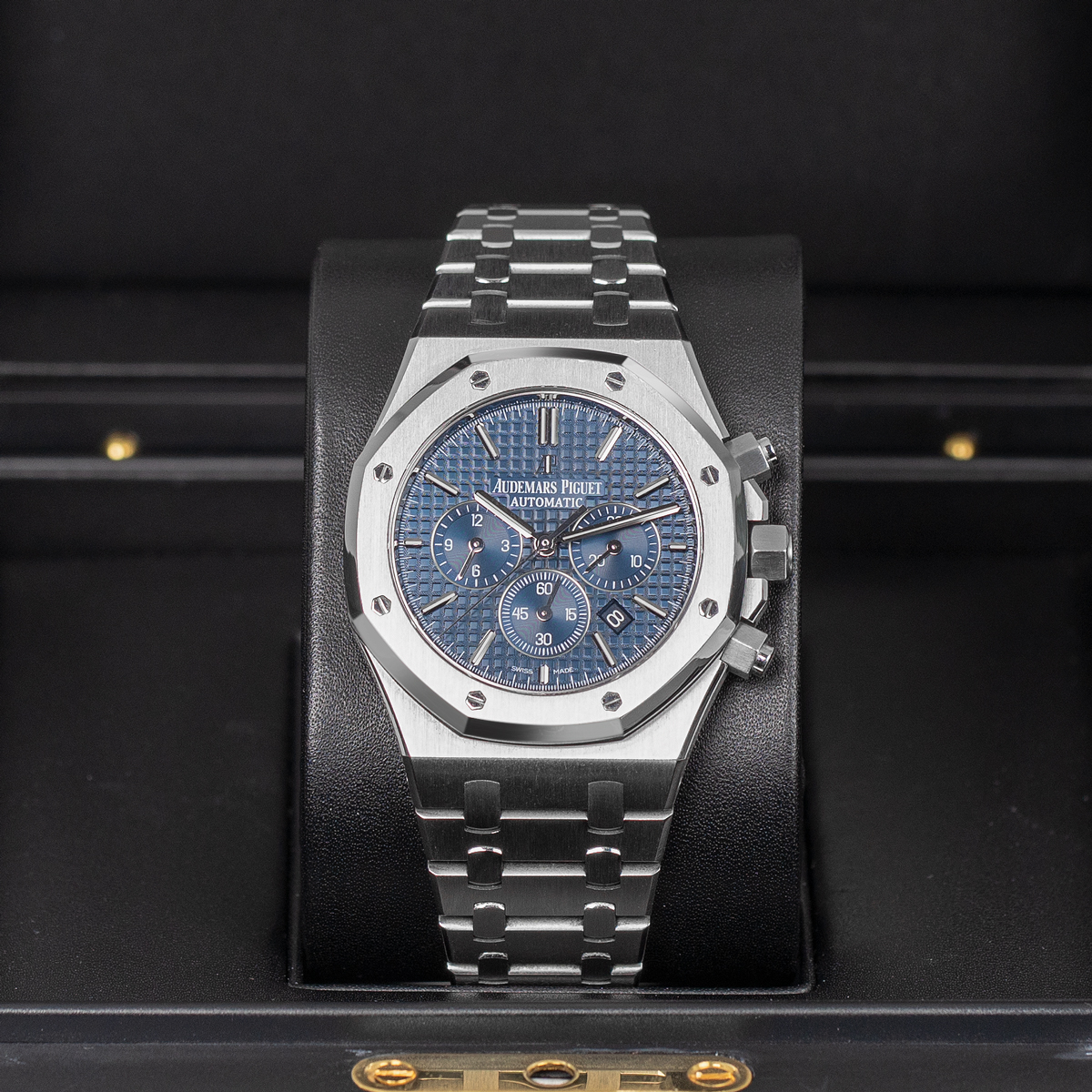 Blue dial with “Grande Tapisserie” pattern, white gold applied hour-markers and Royal Oak hands with luminescent coating.
