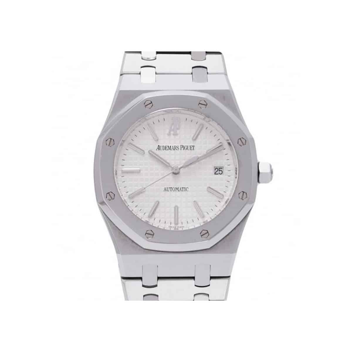 The Audemars Piguet Royal Oak (ref. 15300ST.OO.1220ST.01) features an automatic movement; white guilloche with luminescent markers index markings, luminescent hands dial; sapphire-crystal, transparent case back; and 39 mm, steel case on a steel strap with a steel folding clasp.
