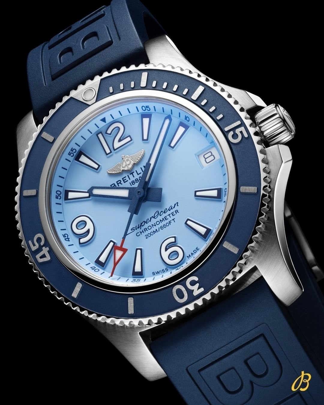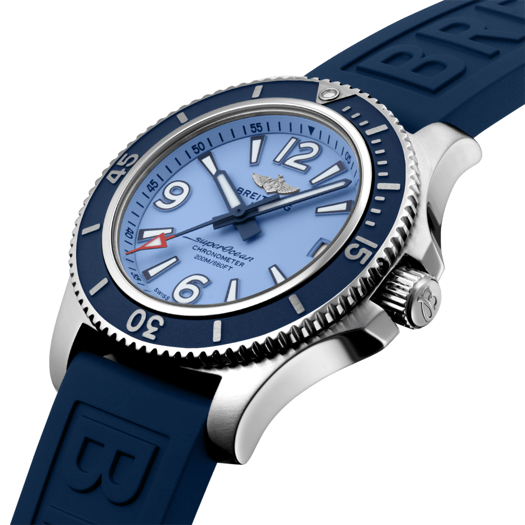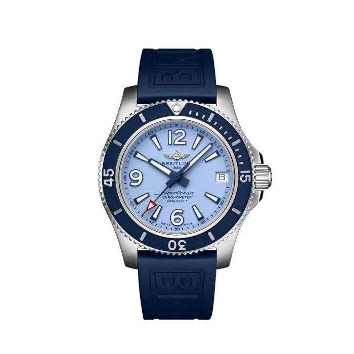 Light blue dial, Unidirectional rotating Stainless Steel bezel, Blue Diver Pro III strap. The Watch comes complete with the original Breitling watch box and Breitling papers.
