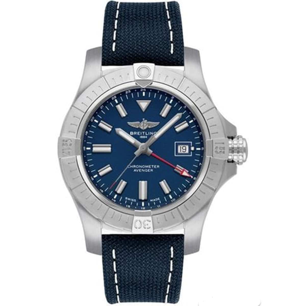 Breitling Avenger II GMT (ref. A32395101C1X2) features an automatic movement; blue with luminescent markers index markings, luminescent hands dial; sapphire-crystal, transparent case back; and 43 mm, polished steel case on a textile leather strap with a polished steel folding clasp.
