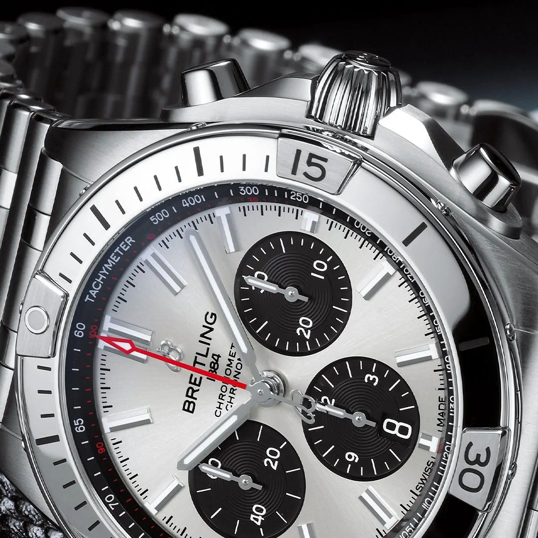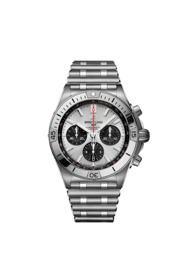 Unworn Breitling Men’s Watch Chronomat B01 42 brushed and polished Stainless Steel. Silver dial with Black sub-dials and Black dial flange with the Tachymeter scale. Polished silver-tone steel applied index hour markers. Polished hands with luminescent fill. Date window between located at the 6 o’clock positions. Small running seconds sub-dial located at the 9 o’clock position. Screw-locked, two gaskets.