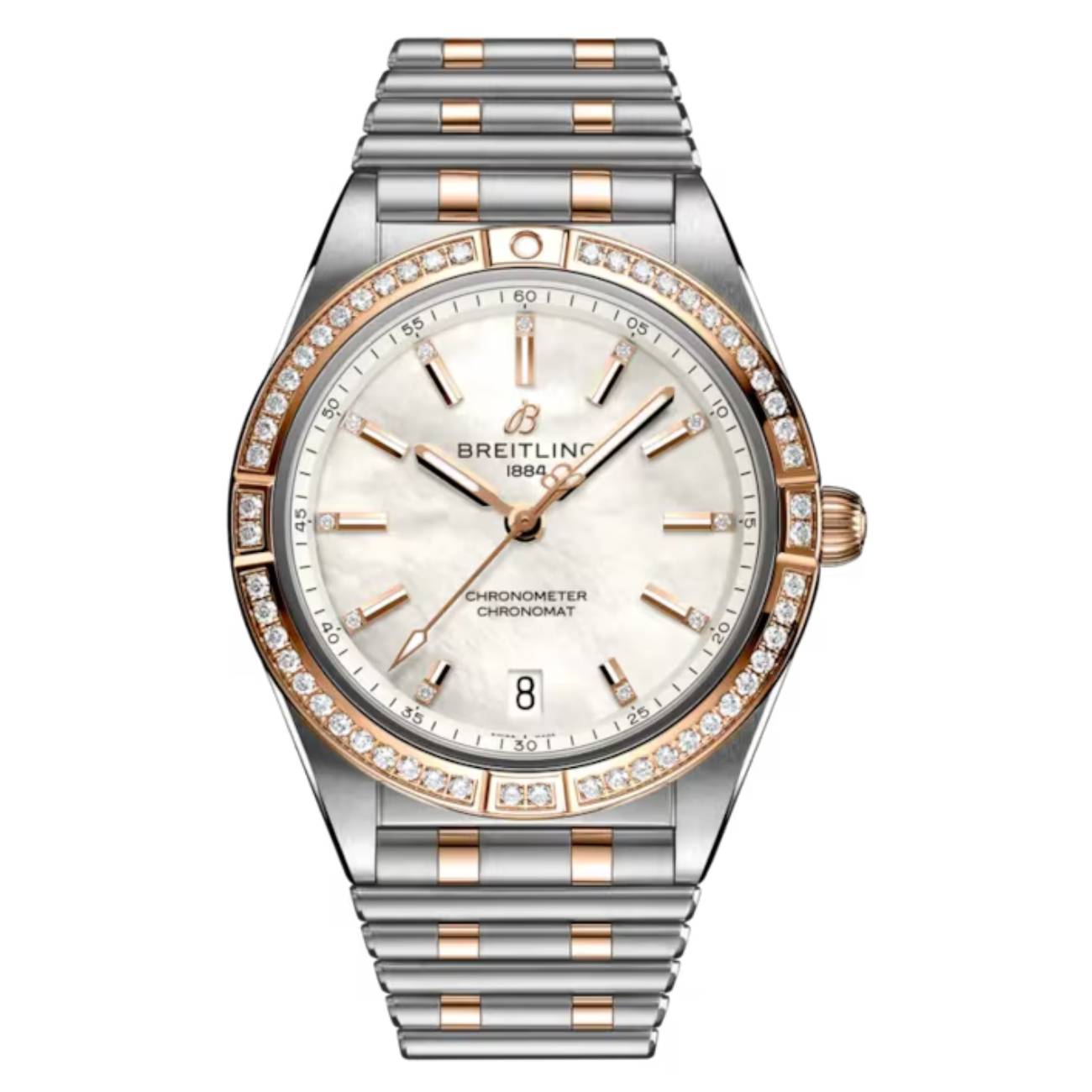 Experience the sophisticated fusion of performance and elegance with the Breitling Chronomat Automatic 36 U10380591A2U1. This 2025 Swiss timepiece features a 36mm case crafted from stainless steel and 18k red gold with gem-set accents, housing the reliable Breitling Caliber 10 automatic movement. The mother of pearl dial with Arabic numerals and luminescent hands offers exceptional legibility, while the unidirectional rotating bezel enhances functionality. Presented in factory-new condition with original box and papers, this watch delivers 100-meter water resistance and comes with its integrated two-tone metal bracelet. Perfect for those seeking a versatile luxury watch that transitions seamlessly from professional settings to sophisticated evening occasions.