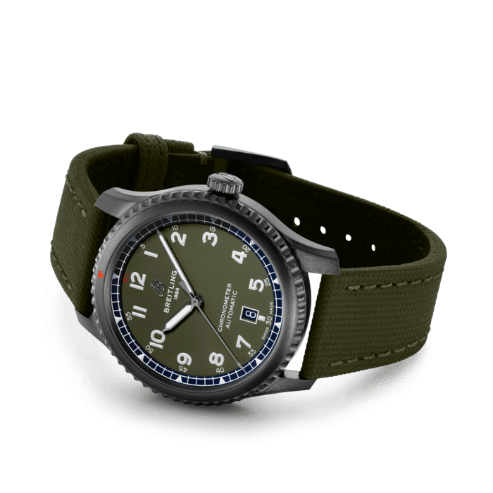 The Bidirectional rotating fluted coin edge DLC-Coated Stainless Steel bezel. Breitling COSC Certified caliber 17 contains 25 jewels and has an approximate power reserve of 40 hours. The watch presented on a Green Fabric Strap with Tang Buckle Clasp. The water resistance is up to 100m/330ft.