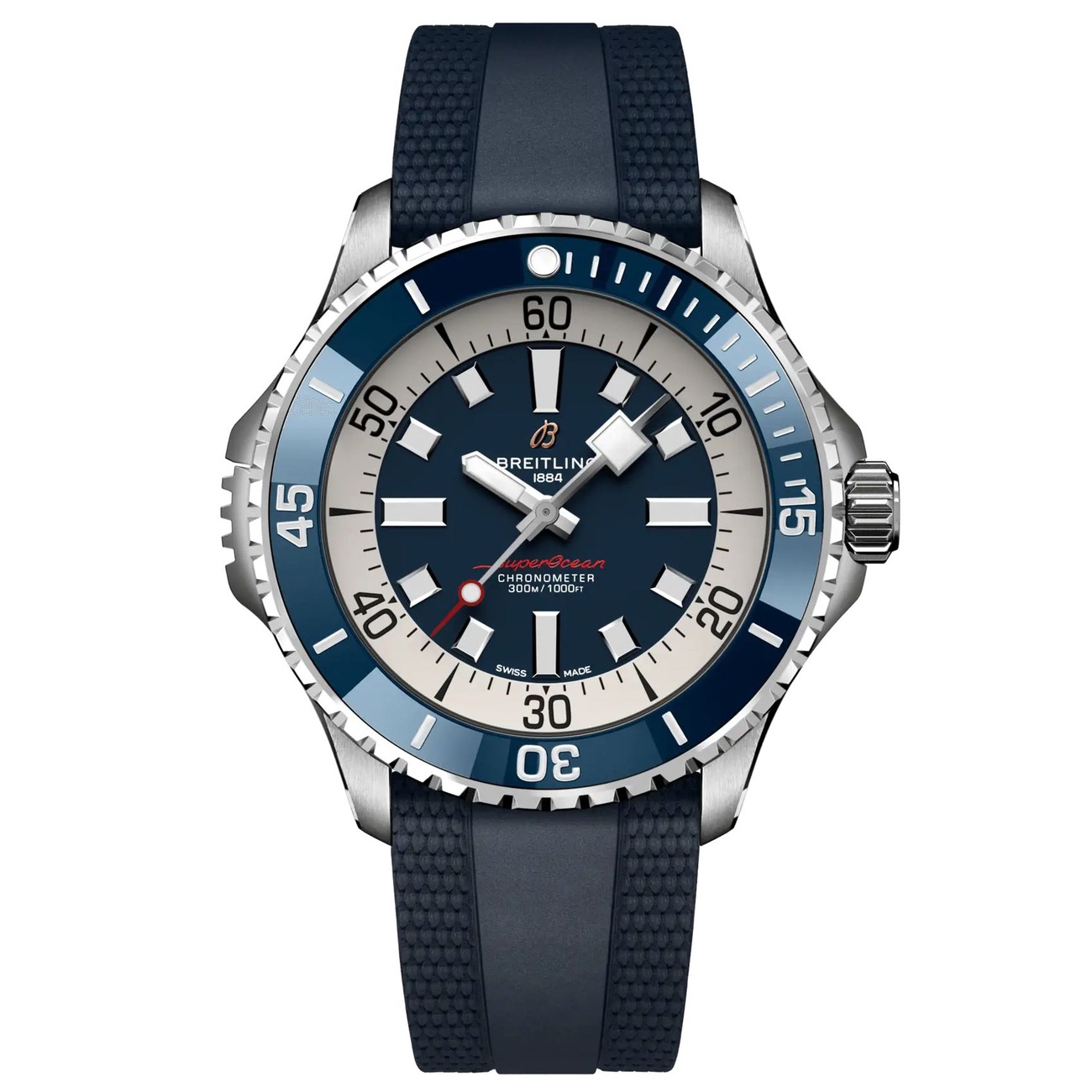 The Breitling Superocean collection represents the brand’s deep commitment to professional diving instruments, combining technical prowess with rugged elegance. This A17378E71C1S1 model features a substantial 46mm stainless steel case engineered for maximum durability and water resistance up to 300 meters. The bi-directional rotating blue ceramic bezel provides essential timing functions for divers, while the scratch-resistant sapphire crystal ensures optimal legibility in challenging conditions. Breitling’s Calibre 17 movement, certified for precision and reliability, powers the watch with a 42-hour power reserve. The luminous hands and markers guarantee readability in low-light environments, making this timepiece equally suitable for professional diving missions and sophisticated urban wear. With its folding clasp and comfortable blue rubber strap, the Superocean offers both security and comfort for active lifestyles while maintaining Breitling’s signature attention to detail and Swiss craftsmanship.