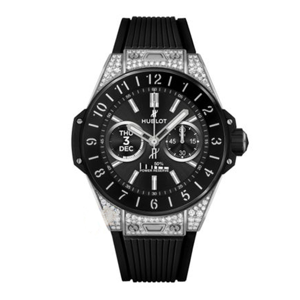 The Hublot Big Bang 42 mm (ref. 440-NX-1106-RX-1704) features an automatic movement; black digital with luminescent markers index markings, luminescent hands; sapphire-crystal, transparent case back; and 42 mm, titanium with diamonds case on a leather strap with a titanium folding clasp.