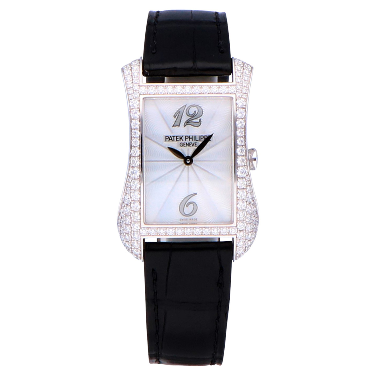 The Patek Philippe Gondolo (ref. 4973G-001) features an quartz movement; white mother dial; sapphire-crystal, transparent case back; and 40×27 mm, 18k white gold case on a satin strap with a 18k white gold folding clasp.