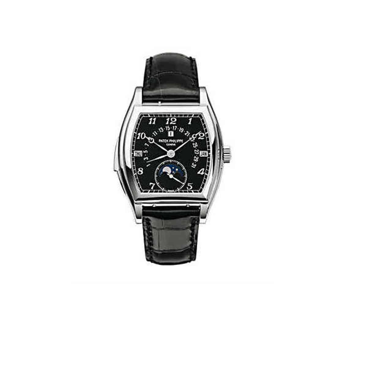 The Patek Philippe Grand Complications (ref. 5013G-010) features an automatic movement; black dial; sapphire-crystal, transparent case back; and 46.4×36 mm, 18k white gold case on a leather strap with a 18k white gold folding clasp.