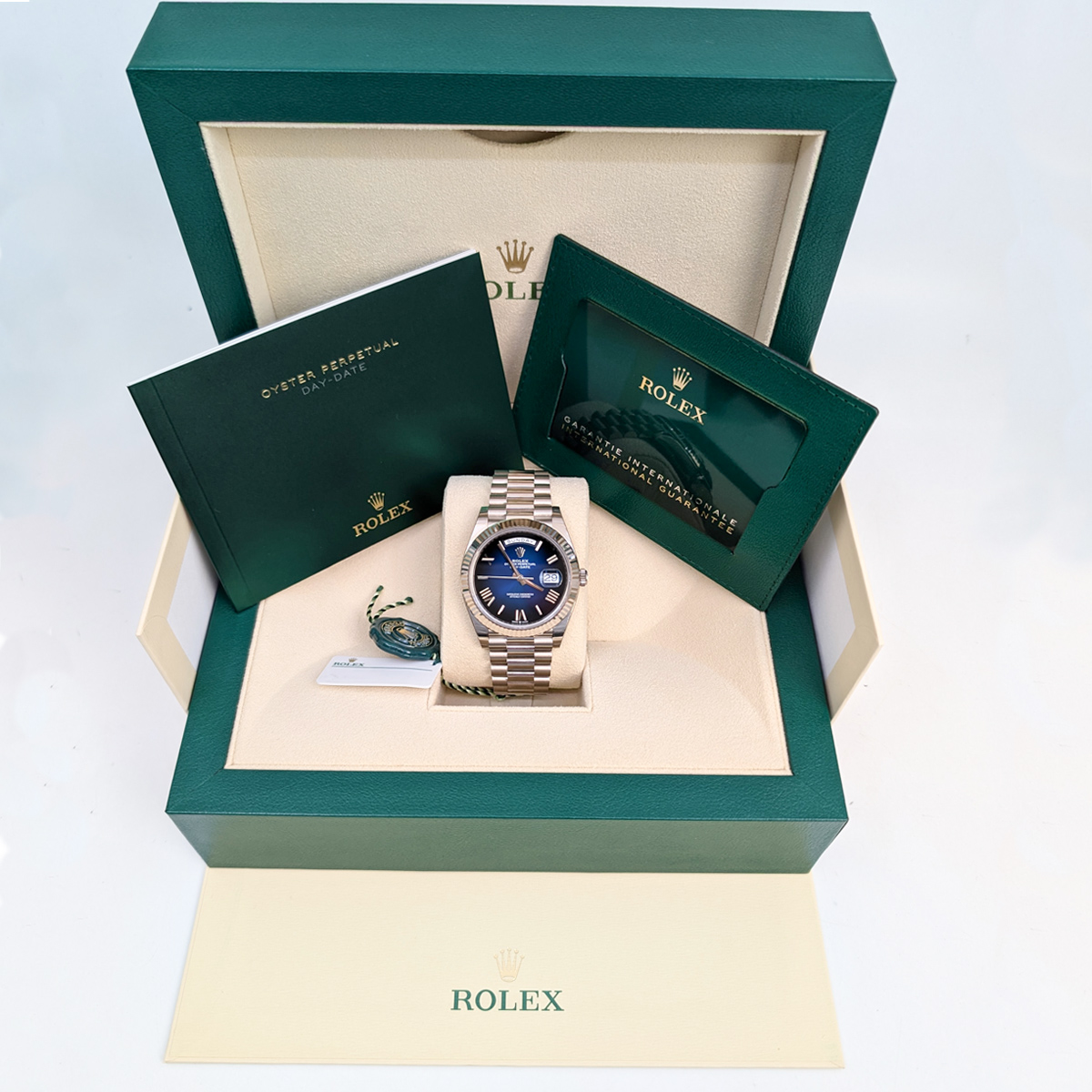Unworn Rolex 228239-0076 Day-Date Blue ombré Dial 40mm White Gold Watch, Complete Set ( Rolex Box and Rolex Papers)