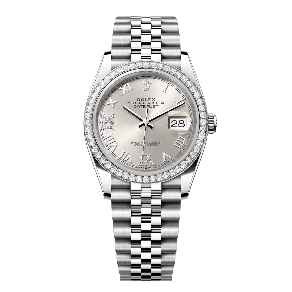 Rolex Datejust 126284RBR-0021 Silver Roman Numeral Set with Diamonds Dial 36mm Diamond Set Bezel Jubilee Bracelet Watch
