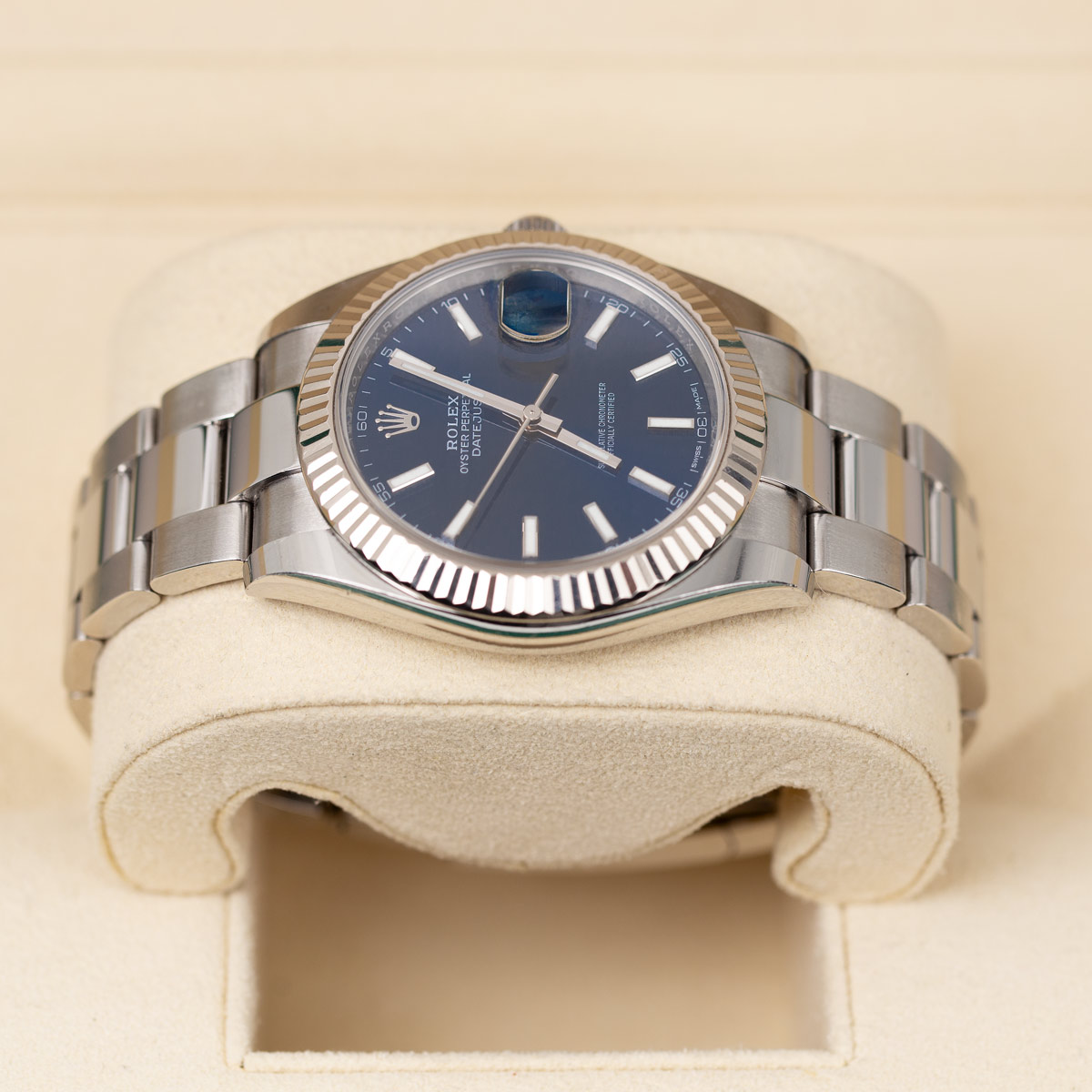 41mm white Rolesor case comprised of a 904L steel monobloc middle case, screw-down steel back, screw-down crown with twinlock double waterproofness system, 18K white gold fluted bezel, scratch-resistant double anti-reflective sapphire crystal with cyclops lens over the date, blue dial, index hour markers.