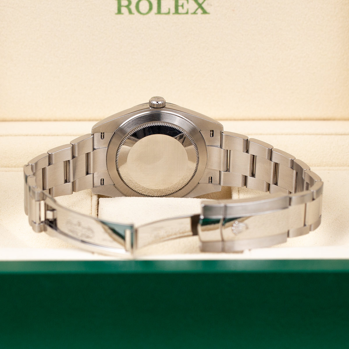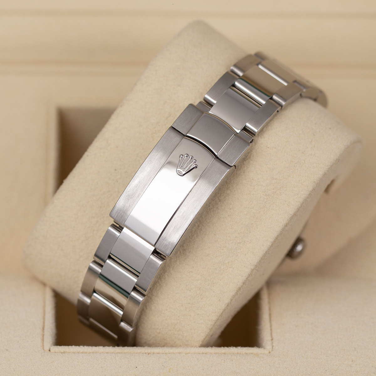 Rolex calibre 3235 perpetual self-winding movement with date at 3 o’clock that changes instantaneously at midnight in a few thousandths of a second, approximately 70 hours of power reserve, 904L steel Oyster bracelet with flat three-piece links, folding Oysterclasp buckle with Easylink 5mm comfort extension link. Waterproof to 100 meters.