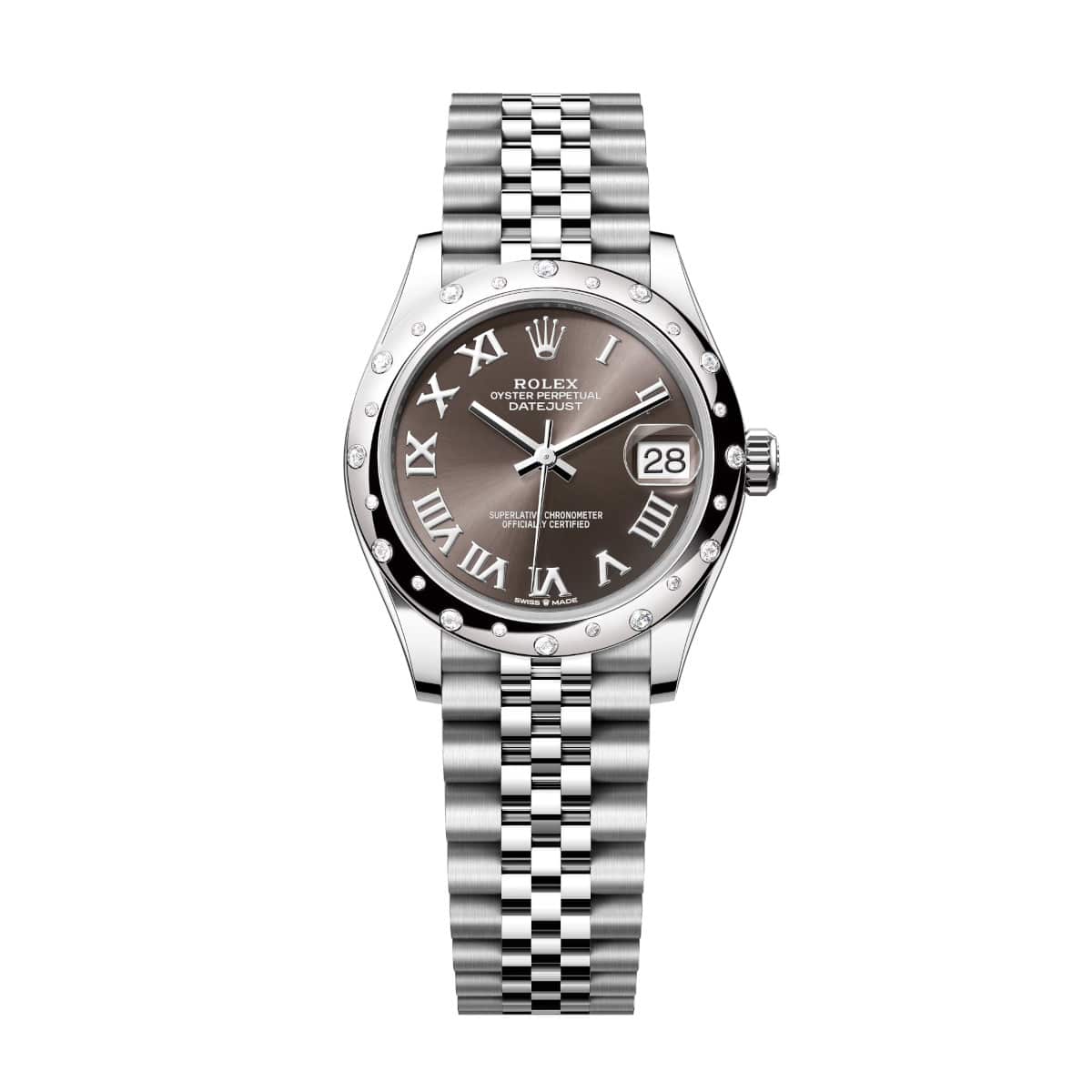 Rolex Datejust 278344RBR-0024 Dark Grey Roman Numeral 31mm Dial Domed Diamond Bezel Jubilee Bracelet White Rolesor Watch
