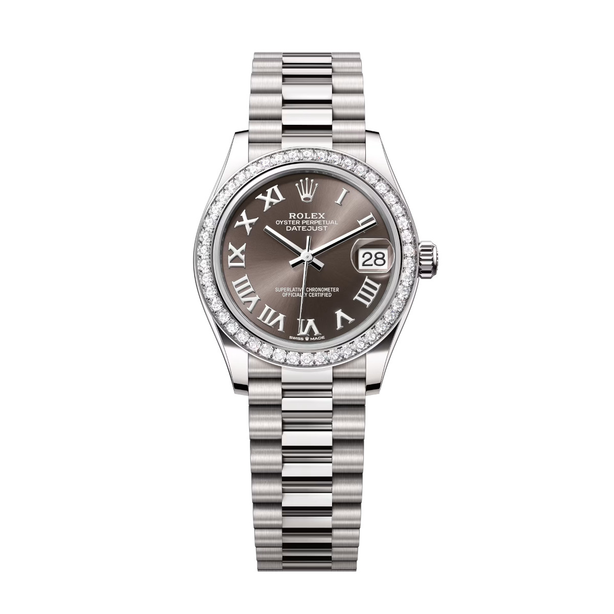 Rolex Datejust 278289RBR-0017 Dark Grey Roman Numeral 31mm Dial Set with Diamonds Bezel 18 kt White Gold President Bracelet Watch