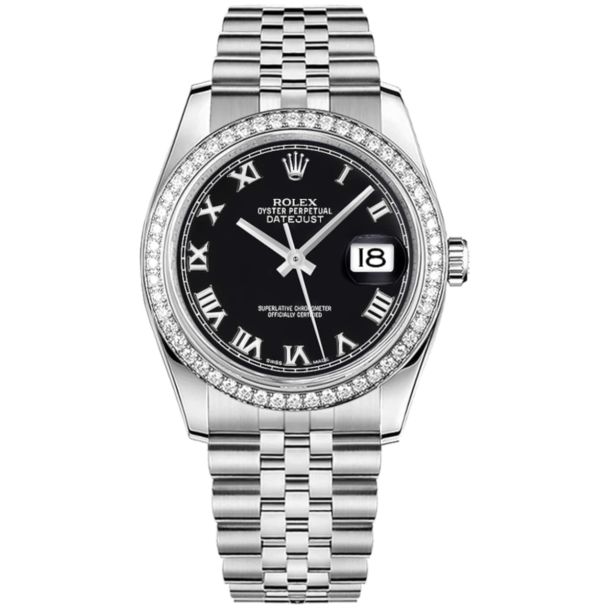 Rolex Datejust 116244-0045 Black Roman Numeral 36mm Dial Diamond Set Bezel Oystersteel Jubilee Bracelet Watch