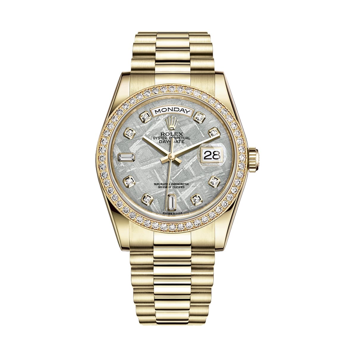 Rolex Day-Date (ref. 118348) watch features selfwinding movement; meteorite diamond dial, diamond bezel, and yellow gold president bracelet; sapphire crystal, and 36 mm yellow gold case.