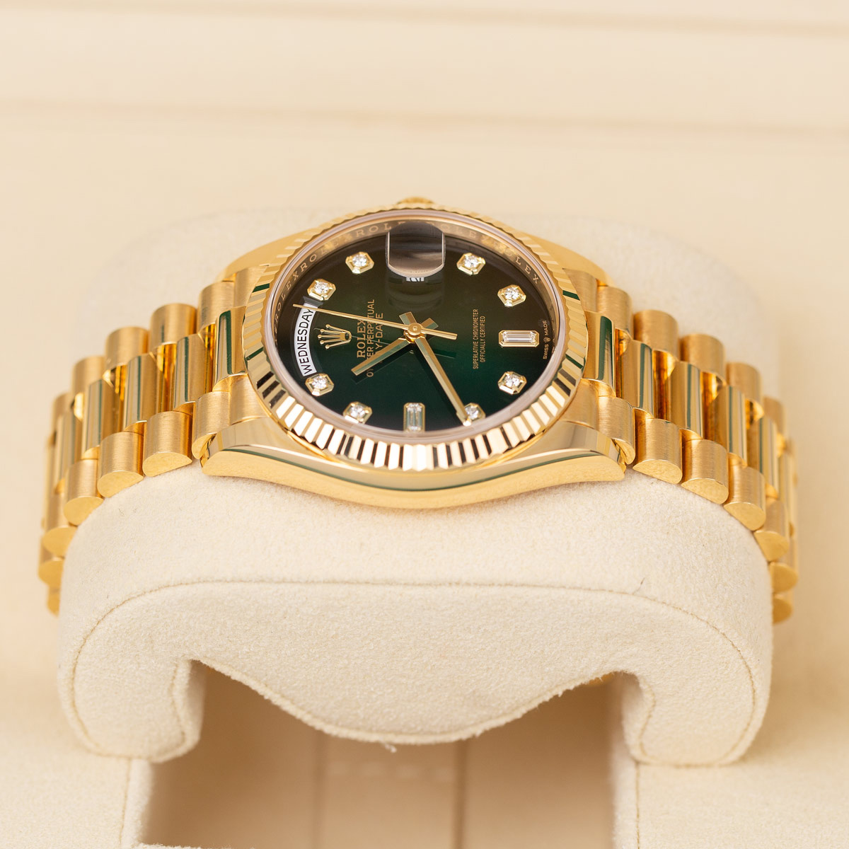 36mm 18K yellow gold case, screw-down back, screw-down crown with twinlock double waterproofness system, fluted bezel, scratch-resistant sapphire crystal with cyclops lens over the date, green ombre´ dial, diamond hour markers, Rolex calibre 3255 perpetual self-winding movement with centre hour, minute and seconds hands, instantaneous day and date in apertures, unrestricted rapid-setting, and stop-seconds for precise time setting, approximately 70 hours of power reserve, 18K yellow gold President bracelet with semi-circular three-piece links, concealed folding Crownclasp buckle. Waterproof to 100 meters.