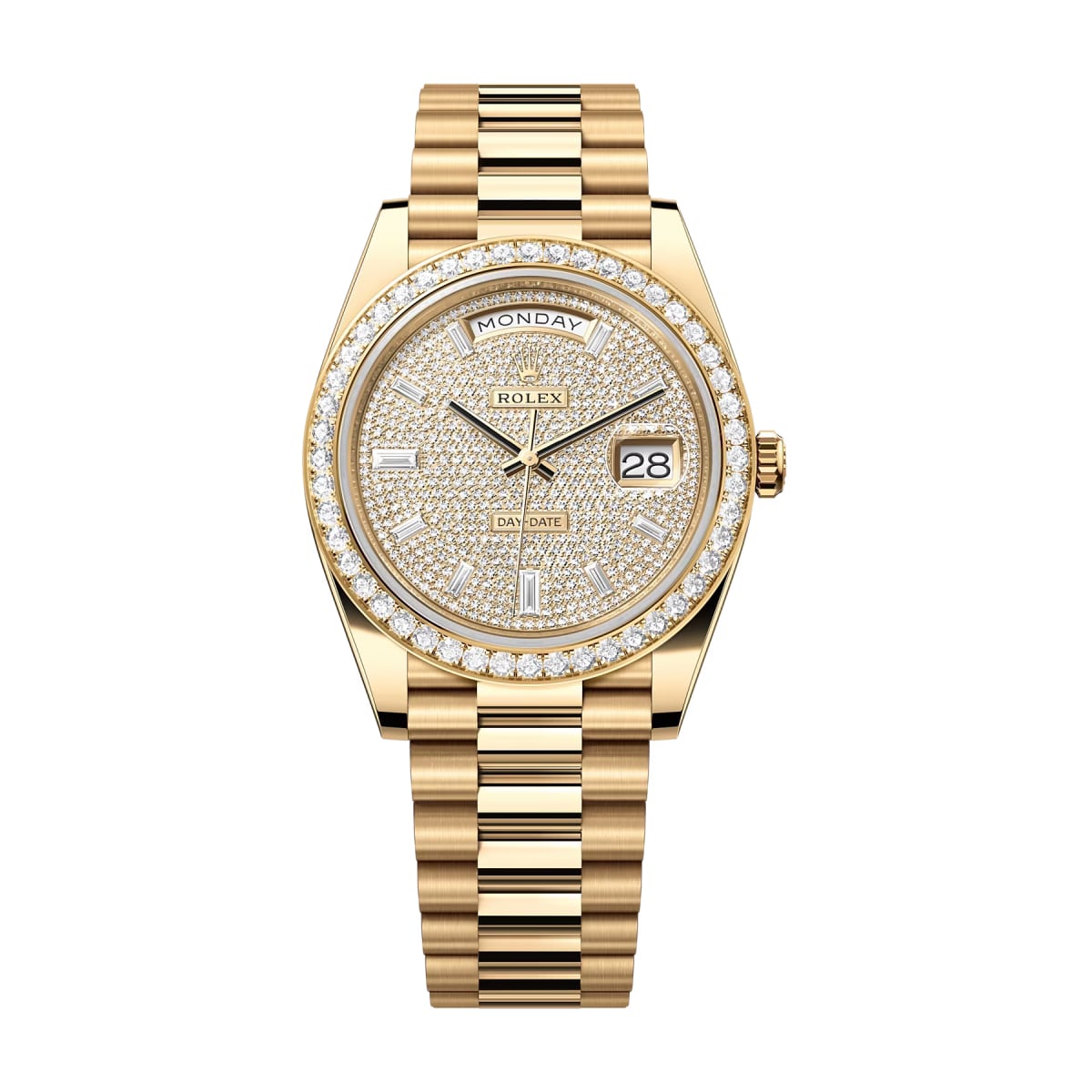 | Gem settings | Diamond-paved dial with 10 baguette-cut diamonds |