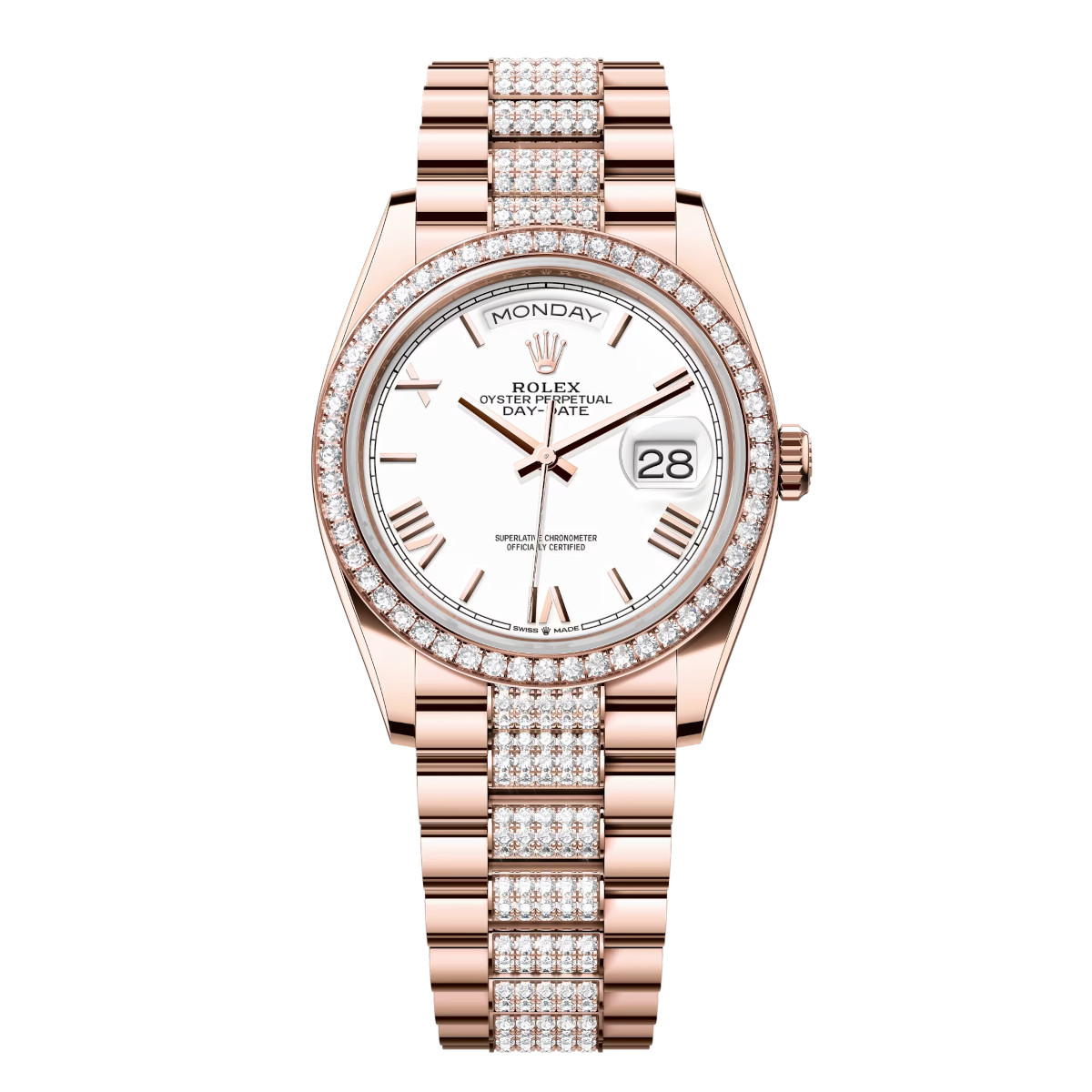 Rolex Day-Date 128345RBR-0071 White Roman Numeral 36mm Dial Diamond Set Bezel Everose Gold Diamond President Bracelet Watch