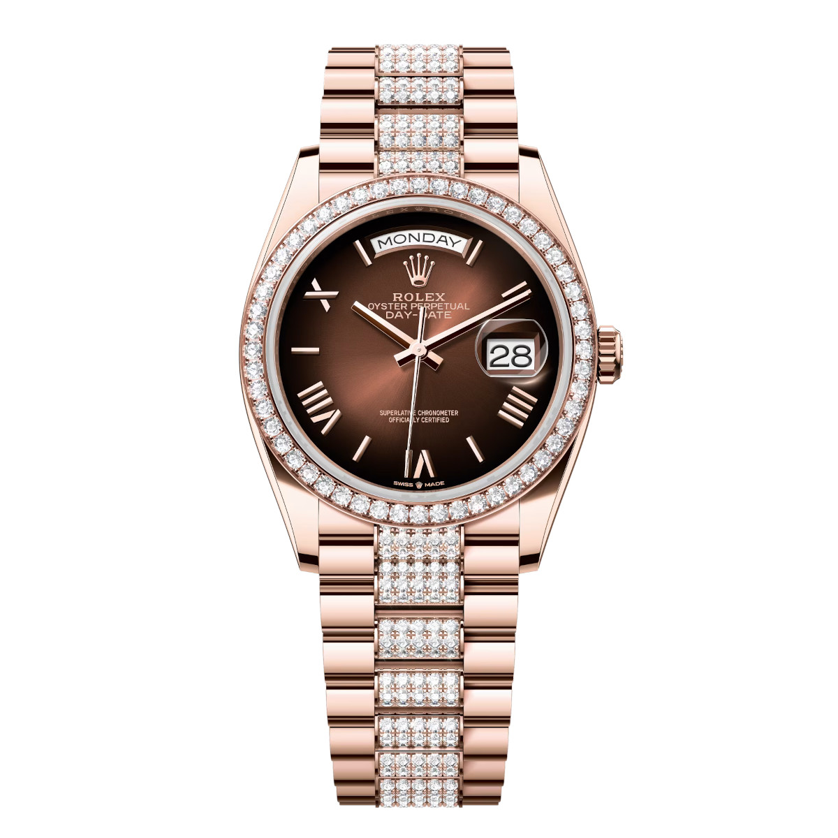 Rolex Day-Date 128345RBR-0076 Brown Ombré Roman Numeral 36mm Dial Diamond Set Bezel Everose Gold Diamond President Bracelet Watch