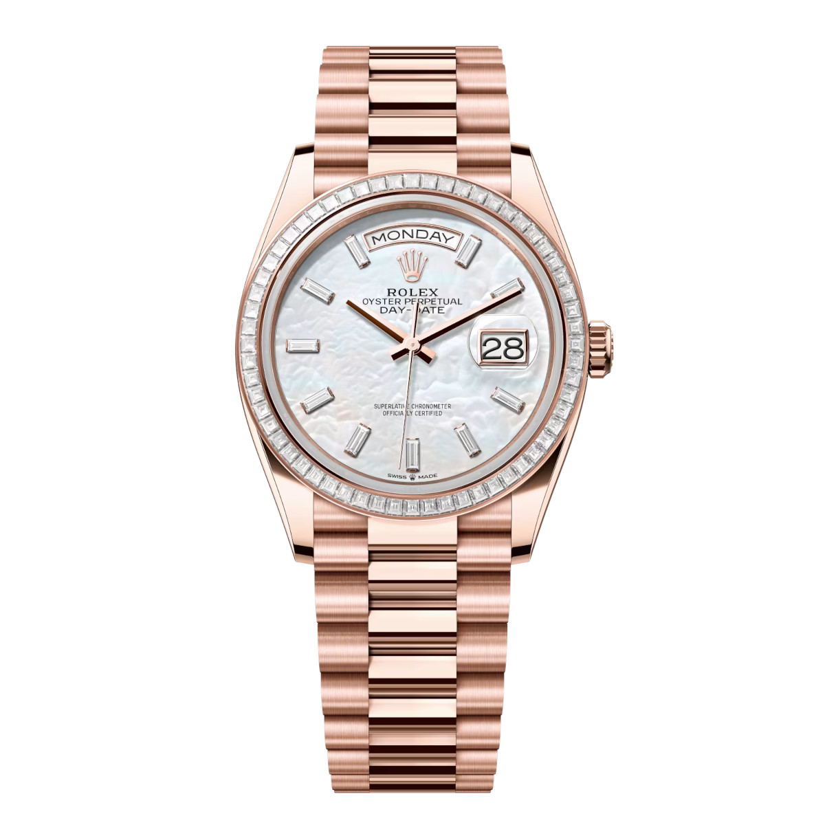 Rolex Day-Date 128395TBR-0026 White Mother-of-Pearl Set with Diamonds 36mm Dial Diamond Set Bezel Everose Gold Diamond President Bracelet Watch