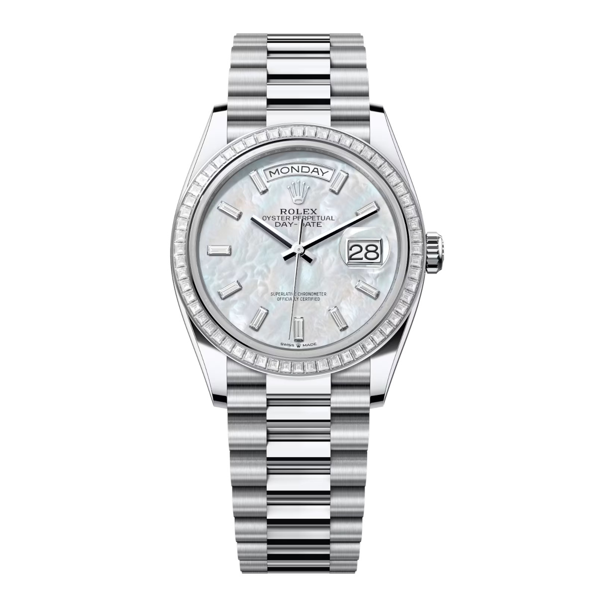 Rolex Day-Date 128396TBR-0022 White Mother-of-Pearl Set with Diamonds 36mm Dial Diamond Set Bezel Platinum President Bracelet Watch