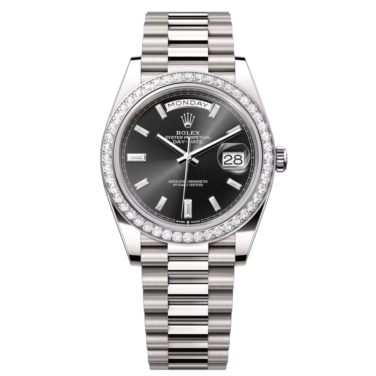 Rolex Day-Date 228349RBR-0003 Bright Black Set with Diamonds 40mm Dial Diamond Set Bezel White Gold President Bracelet Watch