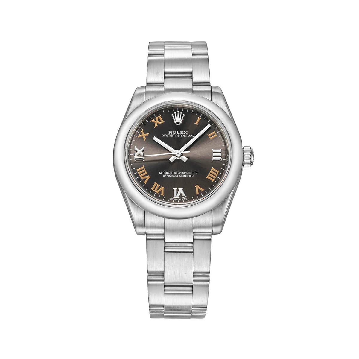 The Rolex Oyster Perpetual 31 (ref. 177200-0018) features an automatic movement; grey with roman numerals dial; sapphire-crystal, transparent case back; and 31 mm, polished steel case on a polished steel strap with a polished steel folding clasp.